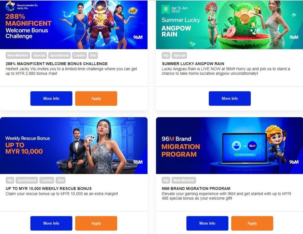 Apart from the Welcome Bonuses, which reward only newly registered players, 96M has a bunch of other bonuses and promotions which target all existing players. Here’s the full list of all the promotions that are available at the moment: