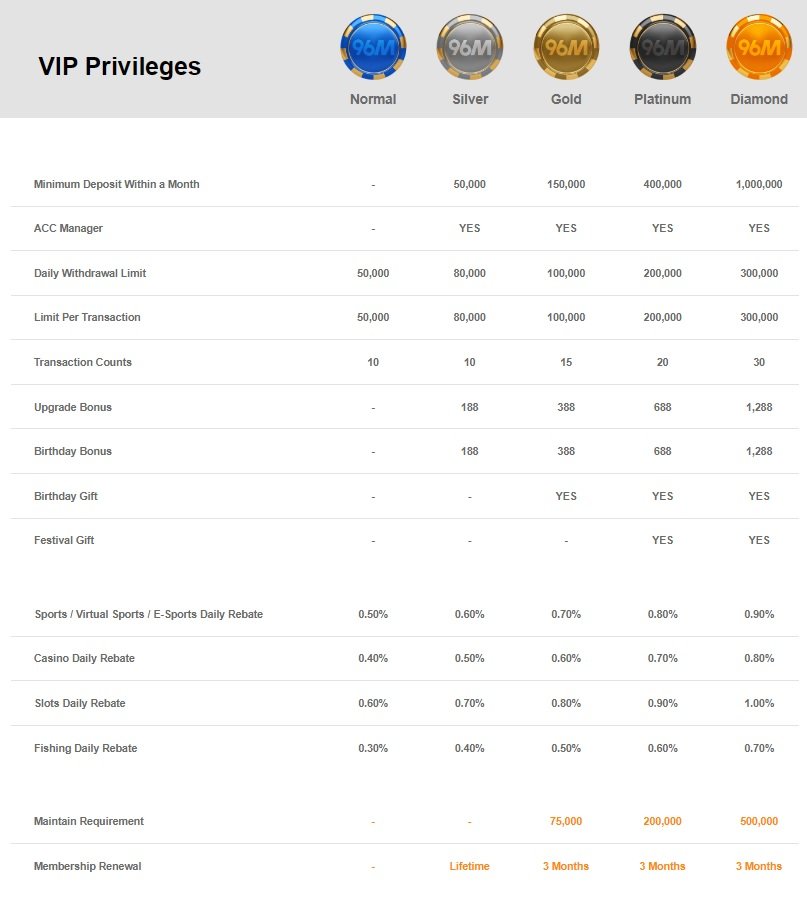 The VIP program at 96M Casino is well-thought-out, and it rewards players who have remained faithful to the casino with special benefits. Every player starts at the Normal level and can progress through the VIP program after reaching MYR 50,000 for the Silver level, 150,000 for the Gold level, MYR 400,000 for the Platinum level, and MYR 1,000,000 for the Diamond level.
