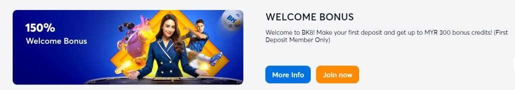 Newly registered members can enjoy the Welcome Bonus. They can double the amount of their first deposit with this bonus before placing a bet. Below are the Welcome Bonuses offered by BK8: