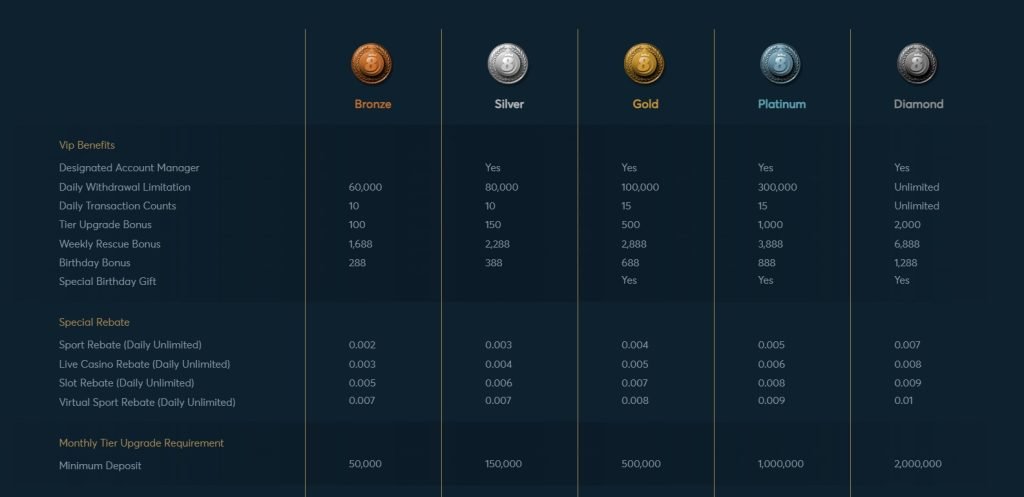The VIP Program has five tiers: Bronze, Silver, Gold, Platinum, and Diamond. As a VIP member, exclusive offers, bonuses, gifts, and priority services are waiting. After playing for a while and making a minimum MYR 50,000 deposit in a month, players can enter the Bronze stage. From there, they have a chance to advance to the next VIP rank. They have to spend a required amount to unlock a new VIP stage each month until they reach the highest level, which is the Diamond requiring a minimum MYR 2,000,000 deposit in a month.
