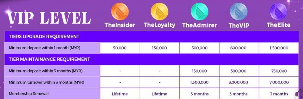 Reaching each unique stage requires a minimum deposit that ranges from 50,000MYR to 1,500,000 MYR. Also, as you get higher in the VIP ranks, you need to meet up with maintenance requirements, including Deposit within three months, turnover within three months, and membership renewal.