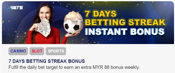 It’s one of the best bonuses offered by Jibets. You can earn an extra MYR 88 bonus weekly by fulfilling the daily bet target. If you achieve a better-than-expected result, you will be rewarded with double the amount in your account. You will need to bet on the same sport for 6 out of 7 days.