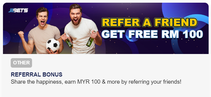 Referral bonuses are back! And this time, we’re offering a bonus of MYR 100 to anyone who refers a friend to Jibets Betting Agency. It’s simple: share happiness and earn your bonus! So what are you waiting for? Start sharing now, and let’s get those referrals rolling!